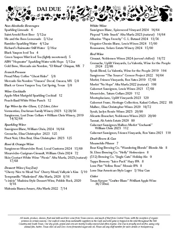 Sample Dinner Drink Menu (Tues-Sat 5pm-10pm and Sun 5pm-9pm)